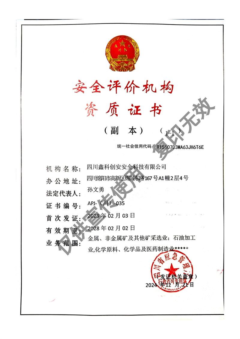 四川鑫科創(chuàng)安安全科技有限公司成立于2020年,是川北地區(qū)取得資質(zhì)的民營安全評價機構(資質(zhì)證書編號:APJ-(川)-035)。并于2022年牽頭成立綜合應急救援隊伍 - 綿陽曙光應急救援中心。